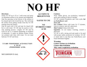Ningún HF es un abrillantador de aluminio que NO contiene ácido fluorhídrico y aún funciona. Seguro en superficies pintadas y vidrio, y aunque su superficie no sea tan brillante, estará cerca. No HF es un producto seguro que sigue siendo una mezcla ácida. A tus empleados les encantará; ya no necesitarán usar un traje de lluvia completo o tubería en el suministro de aire. No experimentarán quemaduras graves en la piel y No HF no se comerá las uñas. Tiene una tasa de dilución de hasta 30 a 1 con agua. Las compras de contenedores de 1 galón se pueden enviar a través de FedEx Express. Contáctenos para baldes de 6 galones o tambores de 55 galones, ya que estos contenedores deben enviarse por camión.